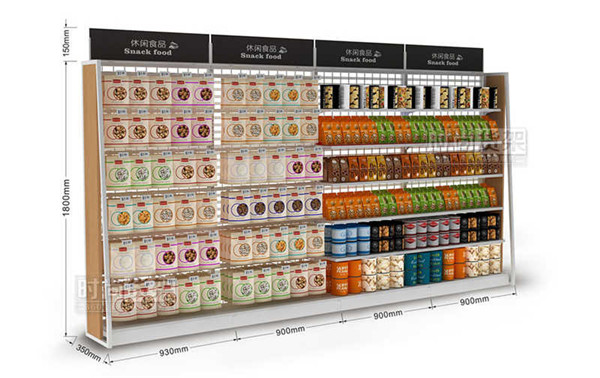 上圖所示是應用于便利店食品區(qū)域的單面食品貨架。便利店單面食品貨架采用了通透性更強的網(wǎng)背板設計,再搭配上簡約時尚的木質(zhì)側(cè)板,整體散發(fā)出一種小清新的氣息,營造出新時代便利店精致、高端的店鋪形象。