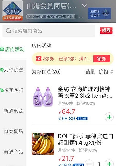 山姆京東到家采取雙價(jià)格顯示形式