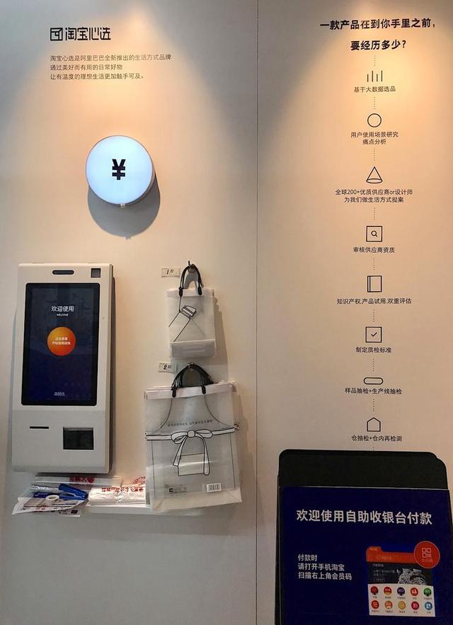 這家店也在著力突顯“智能”和“數(shù)字化”——門口有一個自動販賣機(jī),開業(yè)第一天,附近的居民不少來排隊領(lǐng)取免費(fèi)的購物袋。店面盡頭有一個自助結(jié)賬機(jī)器,需要打開淘寶掃描會員碼,也可以在大潤發(fā)收銀臺結(jié)賬。這家店 3 公里周邊消費(fèi)者也可以在手機(jī)淘寶和大潤發(fā)優(yōu)鮮 APP 上選購淘寶心選的商品,有 1 小時到家的配送服務(wù)。