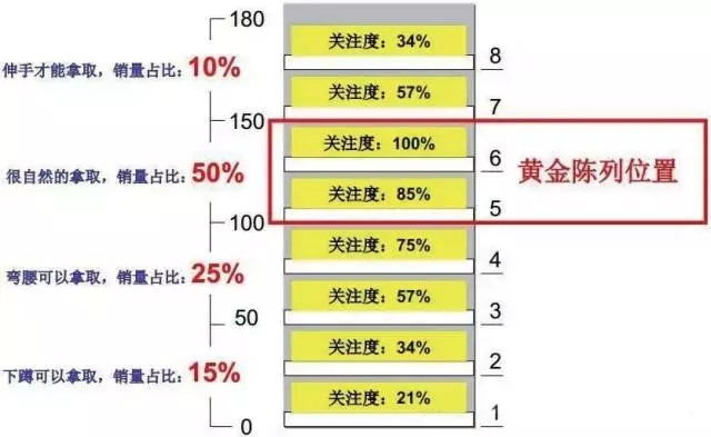 作為超市的經(jīng)營(yíng)者,一定要知道超市貨架的“黃金陳列位置”:亞洲人的普遍身高在160-170cm,所以顧客的視線范圍大多集中在100-150cm的范圍內(nèi),也就是貨架上第3和第4層,把人氣商品放置在這里更容易優(yōu)先讓顧客發(fā)現(xiàn)。