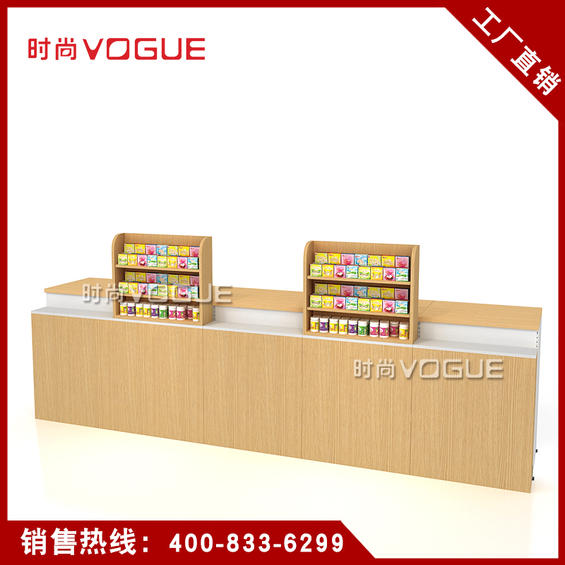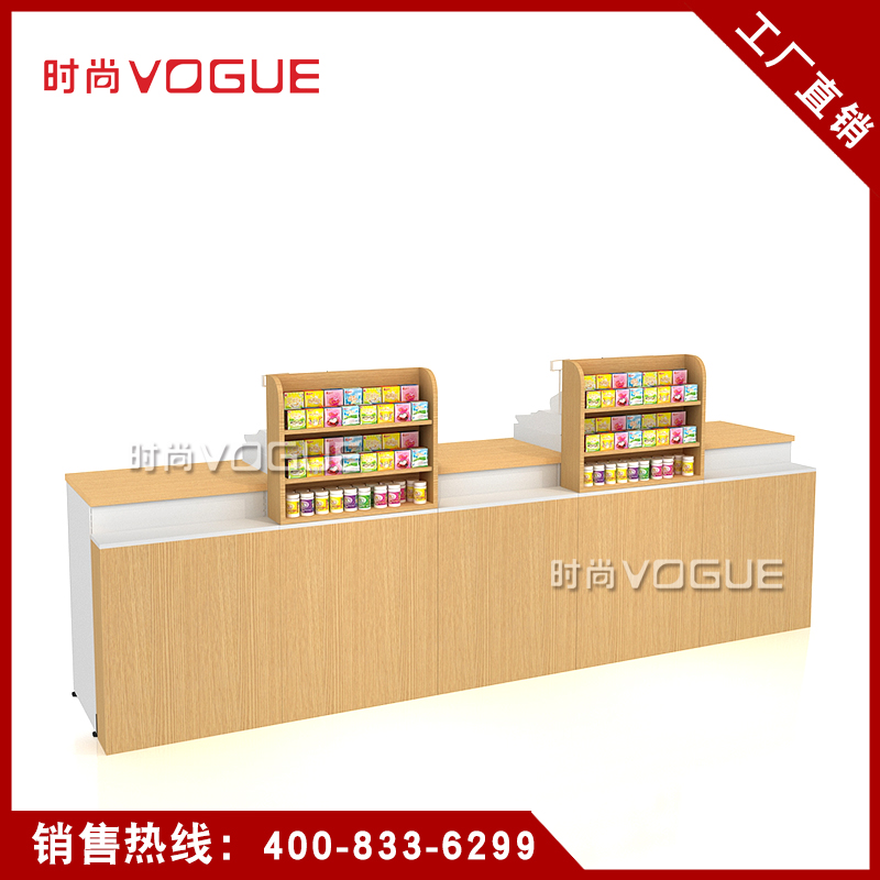 • 產(chǎn)品描述:這是時尚貨架針對母嬰店收銀區(qū)陳列最新推出的一款紅櫻桃木紋收銀臺。