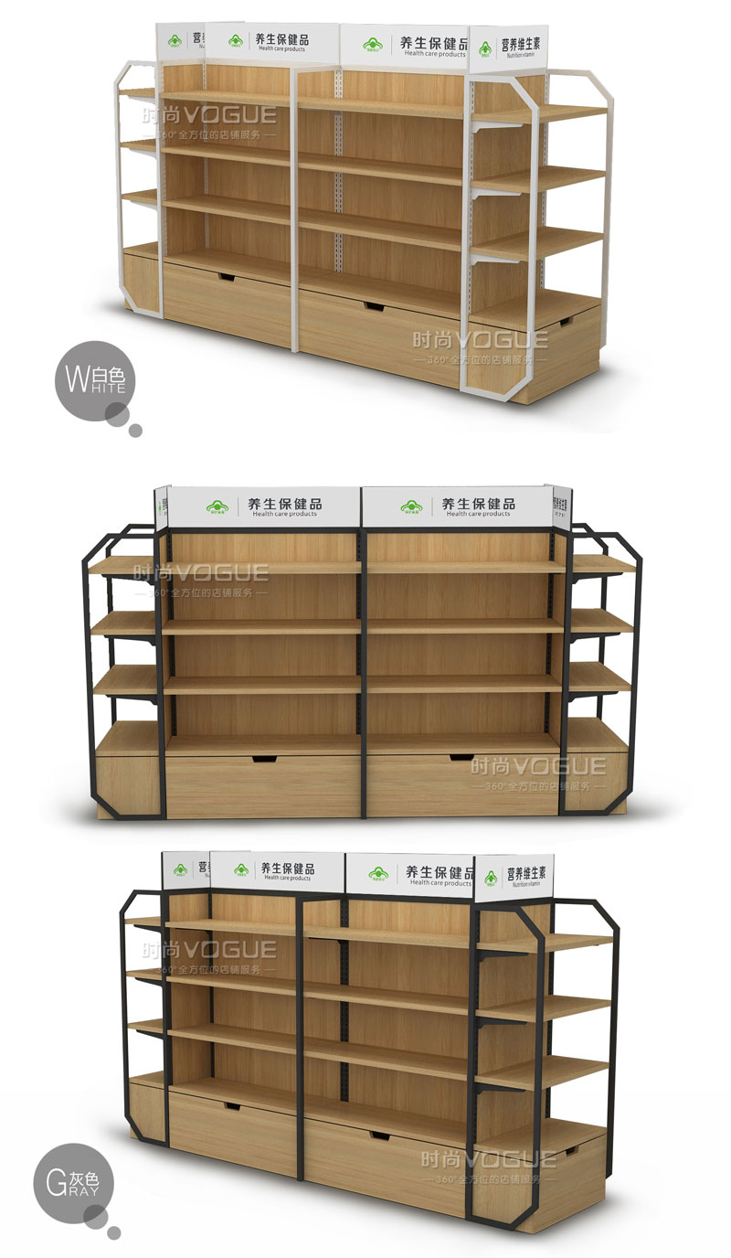 【特點(diǎn)】開放式藥店貨架層板及背板采用更加環(huán)保的高密度環(huán)保木板,無(wú)毒無(wú)異味。再搭配冷軋鋼材質(zhì)的側(cè)框,碰撞之間更突顯藥店高端的店面形象。