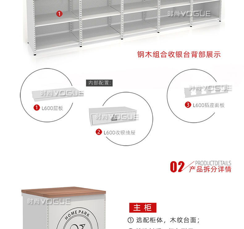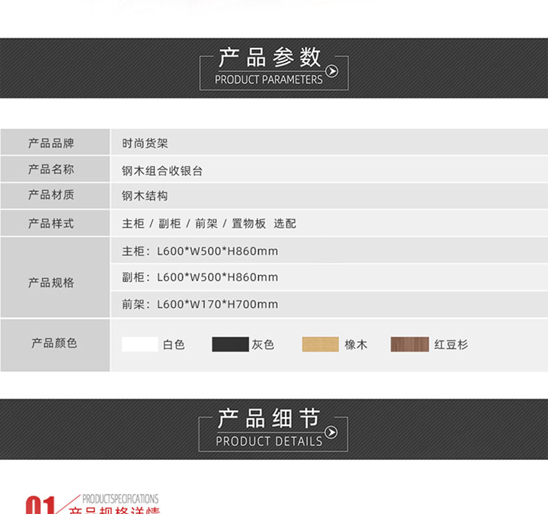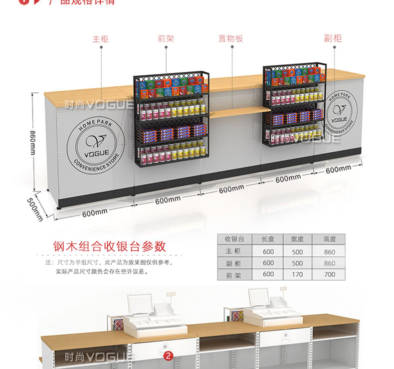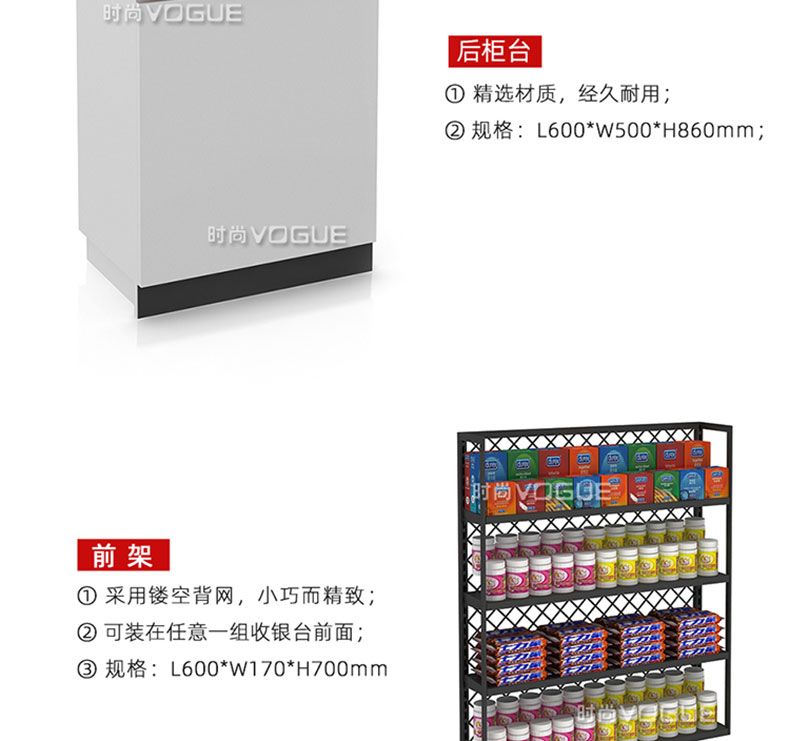 【樣式】主柜+轉(zhuǎn)角柜+側(cè)柜+后柜,可配置小前架、置物板、收銀抽屜