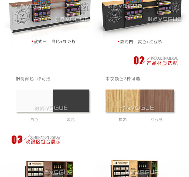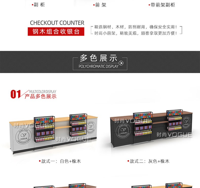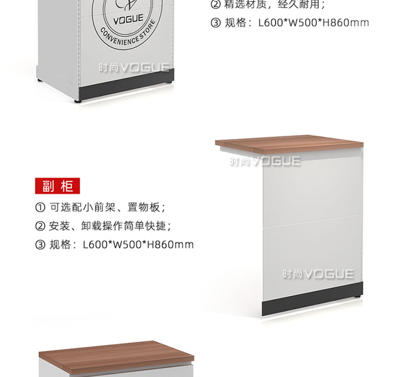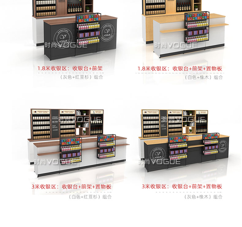 【特點】組合形式,滿足不同收銀區(qū)需求;精選材質(zhì)使用壽命長;擴展側(cè)面空間增強收銀臺功能