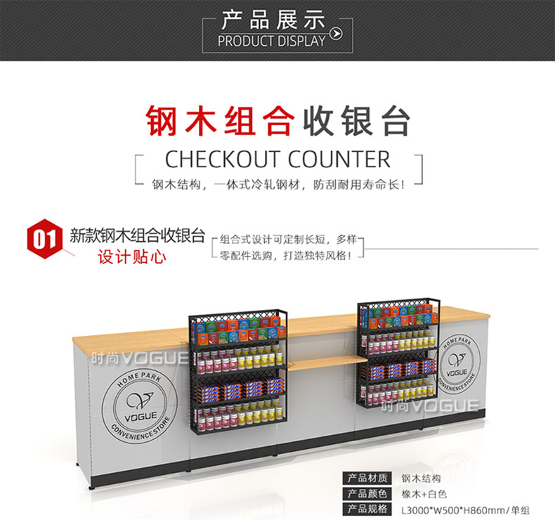 【產(chǎn)品名稱】便利店鋼木收銀臺/超市組合收銀臺/帶前架轉(zhuǎn)角收銀臺