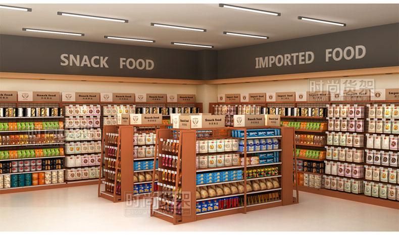 此款貨架為超市貨架廠家時(shí)尚貨架專為超市食品區(qū)域打造,整體框架由優(yōu)質(zhì)冷軋鋼材精制而成,承重性強(qiáng)。
